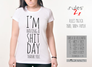 Zenska Rules majica sa natpisom I am having a shit day thank you – Tabela velicina April 10, 2016 by majica No Comments Share: